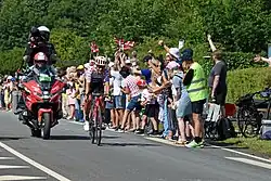 During the second week, stages 10 and 18 were disrupted by Climate Change protesters, which forced stages to be halted for a short period.[20][21][22] Media discussed the legitimacy of the protest[23] and the effect that climate change was having on the Tour,[24][25] while other coverage expressed annoyance at the disruption to the race.[26][27] The second week of the race was affected by an intense heat wave, with several stages having temperatures of around 40 °C (104 °F).[25][28] Some riders suffered heat stroke including Alexis Vuillermoz on stage 9.[29]