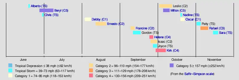 Tropical Storm SaraHurricane RafaelHurricane Oscar (2024)Tropical Storm Nadine (2024)Hurricane MiltonHurricane Kirk (2024)Hurricane HeleneHurricane FrancineHurricane Ernesto (2024)Hurricane DebbyTropical Storm Chris (2024)Hurricane BerylTropical Storm Alberto (2024)Saffir–Simpson scale
