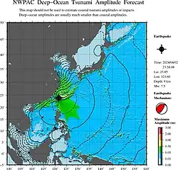 A tsunami was triggered by the earthquake, with a maximum height of 1 m (3.3 ft) in parts of Hualien City.[3] A 0.5 m (1 ft 8 in) wave was observed in Chenggong, Taitung, while an 82 cm (32 in) surge was recorded in Wushi Harbor. The CWA issued an alert advising residents to evacuate to higher ground.[30][31] The Ministry of Natural Resources of the People's Republic of China issued a second-highest level orange tsunami alert, warning of potential localized waves that could cause significant damage in affected coastal areas.[32]