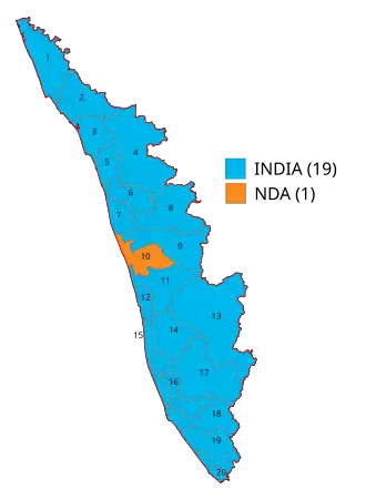 The United Democratic Front (UDF), led by Indian National Congress (INC), and Left Democratic Front (LDF), led by Communist Party of India (Marxist), contested separately in Kerala. This is in spite of both alliances being part of the Indian National Developmental Inclusive Alliance (INDIA)[2] The UDF swept the elections winning 18 out of 20 seats, one less than in 2019. The Bharatiya Janata Party (BJP) won in Thrissur, their first ever Lok Sabha seat in Kerala, while the remaining seat was won by LDF.[3]
