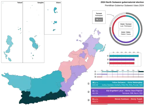 The 2024 North Sulawesi gubernatorial election was held on 27 November 2024 to elect the governor of North Sulawesi for a five-year term. They were held as part of local elections across Indonesia. The previous election was held in 2020. The election was won by Yulius Selvanus of the Gerindra Party with 36% of the vote. He defeated the Democratic Party's Elly Engelbert Lasut, who placed second, and Steven Kandouw of the Indonesian Democratic Party of Struggle (PDI-P).