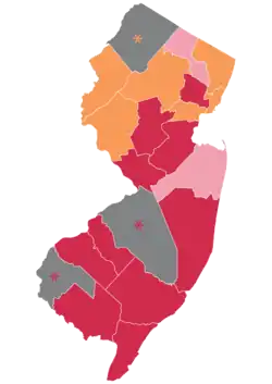 Uniquely among the states, New Jersey law authorizes a county chair of the county political party to make their own sole decision as an individual as to whom to award the line.[45] Nevertheless, excluding Sussex and Salem, which do not award a line but do provide an endorsement, processes vary by custom in each county as detailed in this collapsible table on the primary lines as awarded during county award season:[46][47][48][49]
