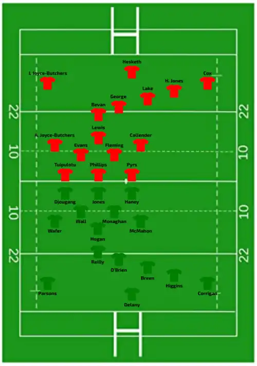 - Jasmine Joyce-Butchers, Kelsey Jones, and Nel Metcalfe were originally named in the respectively in the Welsh starting line-up on the wing, bench at hooker and bench on the wing, but withdrew before the match due to injuries. They were replaced by Lisa Neumann, Molly Reardon, and Courtney Keight respectively.[21][23]