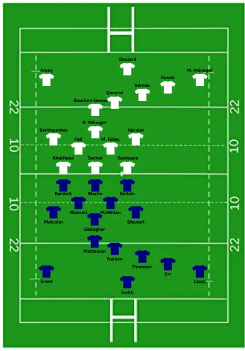 | Try: Martin 35' m | Report | Try: Arbey 53' m Gros 80' +1 c Con: Queyroi (1/2) 80' +2 Pen: Queyroi (1/1) 14' |
