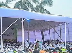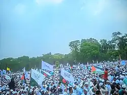 On May 3, from early morning, supporters of Hefazat began gathering at Suhrawardy Udyan in Dhaka, arriving from various districts across the country in organized processions. The influx of participants caused traffic disruptions in Shahbag and surrounding areas.[19] The rally formally commenced at 9:00 a.m. with a recitation from the Quran.[20] By 10:00 a.m., the main venue was nearly full, prompting attendees to occupy nearby areas such as Ramna Park, the Matsya Bhaban intersection, and the surroundings of the Institution of Engineers, Bangladesh.[21] Participants carried flags of Palestine and Bangladesh, as well as banners with Islamic inscriptions,[22] and chanted slogans opposing the interim government, the Women's Affairs Reform Commission, and calling for legal action against Sheikh Hasina.[23] Mahmudur Rahman of Amar Desh and NCP leader Hasnat Abdullah attended in solidarity.[21] Hefazat volunteers managed traffic control and maintained cleanliness in the nearby Dhaka University area.[24] Hefazat leaders stated that policies contrary to the Quran and Sunnah would not be accepted in a Muslim-majority country. They opposed any law perceived to contradict Islamic principles and demanded the immediate dissolution of the Women's Affairs Reform Commission along with its report. They also called for judicial proceedings for the Shapla Square massacre and demanded that all legal cases against Hefazat members be withdrawn within two months. Additional demands included the prosecution of Sheikh Hasina and a ban on the Awami League's political activities. Speakers also urged the interim government to refrain from allowing a humanitarian corridor in Rakhine, Myanmar.[25] During the rally, Mahmudur Rahman asserted that the July revolution martyrs had fought not for a women's commission but to free Bangladesh from authoritarian rule.[26] Hasnat Abdullah rejected any potential political reintegration of the Awami League and demanded capital punishment for Sheikh Hasina.[27] Enayetullah Abbasi called for legislation against blasphemy and legal action against individuals associated with the women's commission.[28] Ahmad Abdul Qader warned that Hefazat's mobilization could destabilize the current administration.[22] Mamunul Haque reiterated that Islam and national independence were interconnected and called for resistance against perceived anti-Islamic elements.[29] The event was presided over by Muhibbullah Babunagari, with a written statement delivered on his behalf by Azizul Haque Islamabadi. The statement reaffirmed opposition to any legislation against Islamic teachings and called for the reformation of the women's commission. It also emphasized Hefazat's stated support for women's rights within an Islamic framework.[30] Mahfuzul Haque then read out a 12-point declaration.[31] Secretary-General Sajidur Rahman announced two upcoming programs: (1) nationwide protests on May 23 to press for four core demands and (2) divisional-level rallies over the next three months to address women's rights issues.[21] The rally concluded at 1:11 p.m. with a prayer led by Babunagari.[31] The event was moderated by Azizul Haque Islamabadi and Kefayetullah Azhari.[31]