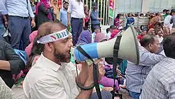 Officials and employees blocking the revenue building in Agargaon, Dhaka. Sit-in procession by employees blocking the revenue building. An employee protester speaking through a megaphone. | |||