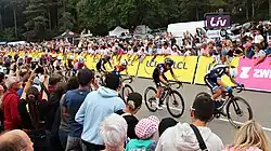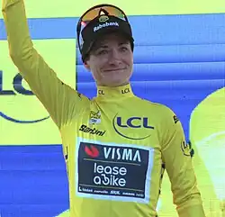 The first stage took the riders on a hilly course to Plumelec in Brittany, the host of the Grand Départ with the finishing circuit including three ascents of a short but steep climb.[29][30] Approaching the intermediate sprint, a large crash involved Movistar Team teammates Liane Lippert and Marlen Reusser – both riders remounted, however Reusser did not rejoin the peloton. Lorena Wiebes (Team SD Worx–Protime) took the maximum points at the intermediate sprint. With 13 kilometres (8.1 mi) remaining, the peloton tackled the climb for the second time, with Elise Chabbey (FDJ–Suez) taking the lead in the Queen of the Mountains (QoM) classification.[31][32] In the closing stages, several riders attempted to break out to win the stage, with Visma–Lease a Bike chasing them back. In the uphill sprint for the finish line, Pauline Ferrand-Prévot (Visma–Lease a Bike) looked set to win before tiring, with Kimberley Le Court (AG Insurance–Soudal) and then Marianne Vos (Visma–Lease a Bike) overtaking her – Vos won the third Tour stage in her career, taking the yellow jersey of the general classification (GC) as well as taking the lead in the points classification.[31] Julie Bego (Cofidis) took the lead of the young rider classification. Other GC contenders finished in the bunch, with the exception of Reusser who abandoned the race, suffering from illness that had previously affected her at the Giro d'Italia Women.[33][32]