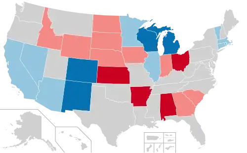 | Map of the incumbents: Democratic incumbent Term-limited or retiring Democrat Republican incumbent Term-limited or retiring Republican Independent incumbent No election | |