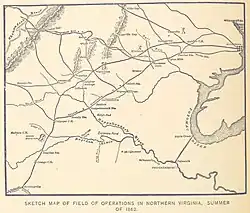 As Gen. Robert E. Lee advanced on Pope's position along the Rapidan River, Pope quickly withdrew his army north. The brigade to which the 21st belonged, now commanded by Col. Edward Ferrero, frequently found itself in the position of rear guard during this movement, skirmishing with the advancing Confederate cavalry.[30] By the time the 21st reached Warrenton, Virginia, on August 27, it was clear to the men that something was wrong. Pope was seen riding by the regiment, "looking warm and excited",[31] and the men learned that Lt. Gen. Thomas Jackson had flanked the Union army and was now in their rear.