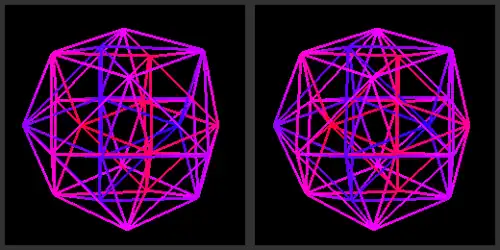 The 24-cell, three tesseracts, and three 16-cells are deeply entwined around their common center, and intersect in a common core.[bg] The tesseracts and the 16-cells are rotated 60° isoclinically[m] with respect to each other. This means that the corresponding vertices of two tesseracts or two 16-cells are √3 (120°) apart.[t]