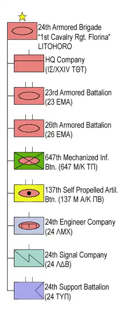 The 24th Armoured Brigade "1st Cavalry Regiment Florina" (Greek: XXIV Τεθωρακισμένη Ταξιαρχία «1ο ΣΙ ΦΛΩΡΙΝΑ») is an armoured brigade of the Hellenic Army, based at Litochoro and subordinated to the I Army Corps.