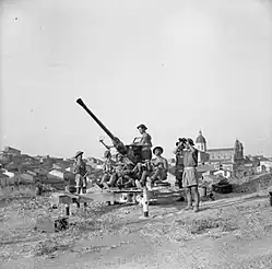 After the entry of Italy into the war in June 1940 there was an urgent need to reinforce British forces in the Middle East, and a series of convoys began shipping troops (including AA units) on the six-week journey via the Cape of Good Hope and the Red Sea to Egypt.[14][15][16][17] 25th LAA Regiment was one of the first units selected and arrived early in 1941. By then the Italian invasion of Egypt had been defeated, but the commitments of Middle East Forces were widening, including campaigns in East Africa and Greece, and the Siege of Malta. On 4 March 1941 225 LAA Bty was put on 12 hours' notice to move to Malta. On 16 March it left El Tahag Camp and moved by rail to the Alexandria area. On 17 March the first party boarded a transport that sailed to Haifa and then in a convoy to Malta. On 20 March the rest of the battery embarked in Royal Navy warships which met the transports from Haifa. the convoy was divebombed on 21 March without serious damage, and docked in Malta on 23 March. The battery proceeded to St Andrews Barracks where it became part of 74th LAA Rgt, which had been formed on the island the previous month.[9][18] It served throughout the Siege of Malta and later took part in the campaigns in Sicily and Italy.[19]