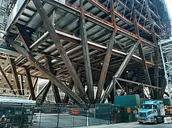 In July 2019, JPMorgan Chase signed an agreement with MTA in which the bank guaranteed that the demolition of 270 Park Avenue would not delay work on East Side Access.[35] That month, scaffolding was wrapped around the tower and podium structure on the Madison Avenue side of the building, the first step in an anticipated 18-month demolition effort.[36] But by late December 2020, only the podium structure had been demolished. Still, parts of the new superstructure were assembled on the Madison Avenue side,[37] and the following month saw the assembly of the new structure's first steel beams.[38] Demolition of the main tower was complete by April 2021; the entire demolition effort wrapped up in June.[39][40]
