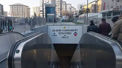 29 Ekim Cumhuriyet (29 October Republic) is an underground station on the M9 line of the Istanbul Metro.[1][2] It is located under 29 October Street in the Yenibosna Central neighbourhood of Bahçelievler. It was opened on 18 March 2024, with the extension of M9 from Bahariye to Ataköy.[1]