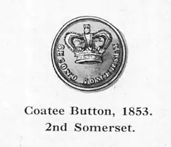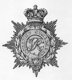 Prior to 1855 the regimental insignia had been the Royal cypher within a crowned garter inscribed Defendemus, with a spray of oak leaves on either side and a scroll beneath inscribed 'SECOND SOMERSET REGT'. The buttons had 'SOMERSET REGT.' surmounted by a crown over '2', or 'SECOND SOMERSET' surmounted by a crown. The officers' waistbelt plate of 1855–74 had the Royal cypher beneath a crown; their Shako plate of 1870 was a crowned cut star with a central design of 'VR' surrounded by a garter inscribed 'SECOND SOMERSET', within an oak wreath with a 'DEFENDEMUS' scroll beneath (see illustration). After the regiment became light infantry in 1876 the centre badge was changed to a bugle-horn. The Glengarry cap badge 1874–81 was a sword with a cross-hilt, point downwards, within a garter bearing the title, surmounted by a Saxon crown.[15][59]