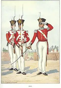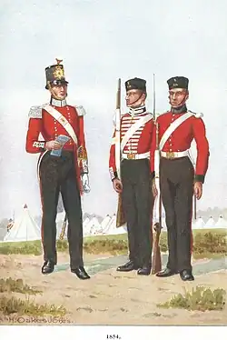 1. ^ It is incorrect to describe the British Militia as 'irregular': throughout their history they were equipped and trained exactly like the line regiments of the regular army, and once embodied in time of war they were fulltime professional soldiers for the duration of their enlistment.