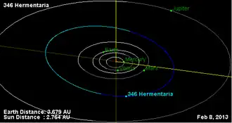 346 Hermentaria is a very large main-belt asteroid. It was discovered by French astronomer Auguste Charlois on 25 November 1892, in Nice. It is probably named for the town of Herment in the region of Auvergne, France.[5] The asteroid orbits the Sun with a period of 4.68 years and an eccentricity (ovalness) of 0.10. The orbital plane is inclined by 8.7° to the plane of the ecliptic.