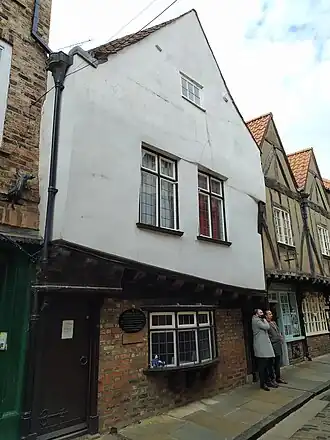 On the ground floor is a shrine to St Margaret Clitherow, who was married to a butcher who owned and lived in a shop in the street. Her home is thought to have been No. 10 Shambles, on the opposite side of the street to the shrine.[2][3][4]