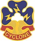 The division's shoulder sleeve insignia (SSI) is a spade shaped shield, bordered in green, with the right half red, the left half blue. Superimposed on the shield is a white monogram "CY" which alludes to the divisional nickname "the Cyclone Division."[3] The distinctive unit insignia (DUI) is in the shape of a clover leaf in memory of the original badge for non-color bearing divisional units. The lightning flashes represent the unit's participation in three World War II campaigns, with the Luzon assault landing recognized by the arrowhead tip in the center flash. The cloud and lightning flashes are an allusion to the cyclone. The colors blue, white and red refer to the Philippine Presidential Unit Citation awarded to the unit for their part in liberating the country.[4]