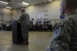 MG R. Martin Umbarger addresses the 939th Military Police Detachment during their departure ceremony on March 28, 2015