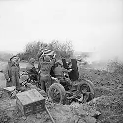 The division next made a long move to the Antwerp area at the end of September, then spent three weeks in the line at Sint-Oedenrode.[44] 51st (H) Division was brought back into the line in October for the operations towards 's-Hertogenbosch to clear the Antwerp area. By the end of the month, after tough fighting, the division had pushed forwards to the River Maas.[45][46][47] The division was then moved to hold 'The Island', the wet low-lying country between Nijmegen and Arnhem, until in mid-December the division was pulled out of the line for rest.[48][49] In December the division was suddenly moved south as part of the response to the German breakthrough in the Ardennes (the Battle of the Bulge), and 51st HD fought its way into the flank of the 'Bulge' in winter conditions.[50][51] When the Luftwaffe launched its Operation Bodenplatte against Allied airfields on 1 January 1945, GHQ AA Troops for 21st Army Group reported that '40 mm LAA had the time of its life' shooting down large numbers of raiders.[52]