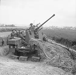 51st (H) Division was a follow-up formation for Overlord, landing on Juno Beach on 7 June (D + 1). It did not complete its assembly until 10 June, but then moved into the bridgehead across the River Orne in preparation for an advance southwards. This bridgehead was under heavy air attack, and the Luftwaffe had developed a pattern of daylight attacks by fighters and fighter-bombers, flying low and using cloud and terrain for cover, before making diving attacks out of the sun. The 20 mm and 40 mm Troops of 40th LAA Rgt, together with 92nd (Loyals) and 4th Canadian LAA Rgts, were in constant daily action in the bridgehead, shooting down 17 enemy aircraft between them and driving off many other attacks.[15][33][34]