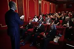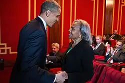 On April 2, 2013, First Lady Michelle Obama hosted a screening of the film at the State Dining Room of the White House for 80 high school and college students from across the country.[63][64] A question-and-answer session featured Robinson's widow Rachel, and members of the cast and crew, including Boseman, Ford, and director-screenwriter Brian Helgeland.[65][66] Michelle noted that both she and President Barack Obama[67][68] found the film "very powerful" and encouraged students to recognize that success requires perseverance rather than innate talent.[69] According to ESPN, Michelle gave 42 a glowing review.[20]