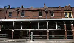 The Terraces significantly form part of a row of terraces (Nos. 26–72 with the exception of the No. 42–44, c. 1985) that demonstrate the evolution of terrace houses in Australia and reference to overseas models. The buildings occupy a prominent location, on the kink of the street and are highly visible when looking north and south of this section of Gloucester Street, their face brick facades and two storey verandahs being in contrast to the neighbouring bald face, rendered terraces on the eastern side of Gloucester Street. The buildings have a strong visual relationship with the Australian Hotel and make a positive contribution to the Gloucester Street streetscape.[1]