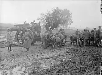47th Siege Bty embarked from Southampton on 26 November under the command of Major Robert Daubuz (who had been stationed on Gibraltar on the outbreak of war).[11] It was equipped with four 8-inch howitzers[b] and accompanied by its Army Service Corps mechanical transport (MT) section (2nd Section, No 593 MT Company of 33rd Bde). The battery disembarked at Boulogne on 27 November and marched across France to Belgium (delayed when one of the howitzers became ditched), arriving on 7 December at Vlamertinghe in the Ypres Salient.[14][15][16][17]