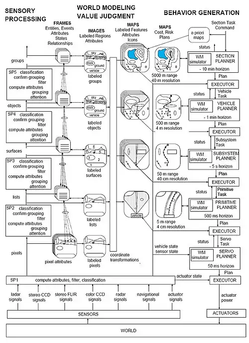 Sensory processing performs the functions of windowing, grouping, computation, estimation, and classification on input from sensors. World modeling maintains knowledge in the form of images, maps, entities, and events with states, attributes, and values. Relationships between images, maps, entities, and events are defined by pointers. These relationships include class membership, ontologies, situations, and inheritance. Value judgment provides criteria for decision making. Behavior generation is responsible for planning and execution of behaviors.[5]