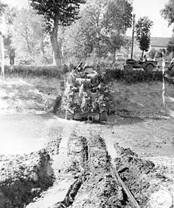 After training in England from January to July 1944, the 4th Armored Division landed at Utah Beach, on 11 July, over a month after the initial Normandy landings, and first entered combat on 17 July; on 28 July, battle action as part of the VIII Corps exploitation force for Operation Cobra, the 4th AD secured the Coutances area. The 4th AD then swung south to take Nantes, cutting off the Brittany Peninsula, 12 August 1944. Turning east, it drove swiftly across France north of the Loire, smashed across the Moselle 11–13 September, flanked Nancy and captured Lunéville, 16 September. The 4th AD fought several German panzergrenadier brigades in the Lorraine area including the SS Panzergrenadier Brigade 49 and SS Panzergrenadier Brigade 51 at this time, defeating a larger German force through superior tactics and training.[6]