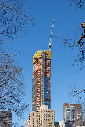 The building was originally to be 25 stories, but the plans were later changed.[3] When plans for an enlarged 775-foot (236 m), 69-story tower were released in late 2017, the tower faced immediate opposition by those living in the neighborhood.[1] The city approved the tower, overriding neighborhood opposition, in December 2018.[4] After neighborhood groups filed a lawsuit to block the project, claiming that increased height was due to misuse of mechanical space,[5] the New York City Board of Standards and Appeals voted to approve the building permit in January 2020.[6][7] The building topped out during late February 2024.[8][9] That July, Extell refinanced the building with a $1.2 billion loan.[10][11]