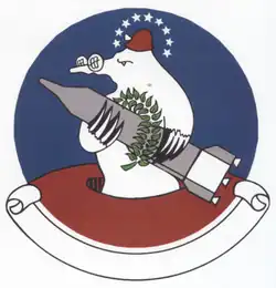 1. ^ Approved 2 March 1962. Description: On an Air Force blue disc, a mound of terra-cotta colored earth; emerging from a hole in the mound, a caricatured mole wearing glasses on the end of his long snout, all white, and a miner's cap terra cotta, and supporting in his arms a silver-gray missile, trimmed in white and entwined with a green olive branch; above the mole's head a halo of nine white stars; outlines and details black throughout. Patches exist that indicate that prior to the approval of this emblem, the squadron used the emblem approved for the squadron it replaced at Warren in July 1961, the 549th Strategic Missile Squadron, with the squadron's number substituted for the 549th's.