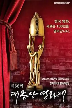 The 56th Grand Bell Awards (Korean: 대종상 영화제; RR: Daejongsang Yeonghwajae), also known as Daejong Film Awards, is determined and presented annually by The Motion Pictures Association of Korea for excellence in film in South Korea.[1] The Grand Bell Awards were first presented in 1962 and have gained prestige as the Korean equivalent of the American Academy Awards.[2] The ceremony was originally scheduled to be held on February 25, 2020, but was postponed due to the COVID-19 pandemic.[3] The ceremony was held on June 3, 2020.[4]