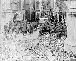 Soldiers of the 57th Brigade (19th Division) hearing mass in the ruined Cambrai Cathedral, 13 October 1918. The Chaplain preaching is Reverend E. Rockliffe of the Society of Jesus (SJ).