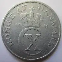 The 5 øre coin was made during the German occupation of Denmark. It was first minted in aluminium in 1941, and then from 1942 to 1945 in zinc.[1] The aluminium 5 øre is similar to the zinc variety, although the latter is a little smaller in diameter and heavier in weight.