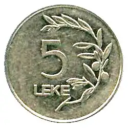 5 Lekë (5 L) have a value of 5 Albanian lek and is composed of a nickel-covered steel. The coin has been used since 1939 and has been redesigned several times, while also being printed as a banknote for the years 1942-1944 during the Italian occupation of Albania.[2][3]