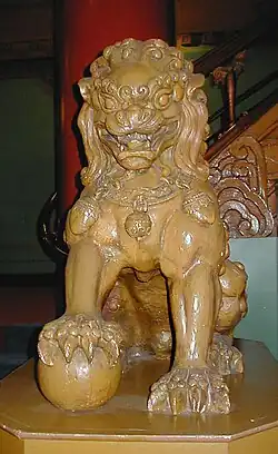 The interior architecture of the theatre is an "excellent imitation of Chinese wooden temple construction".[3] The two story rectangular lobby features red, stenciled columns wrapped in plaster rising to a timbered roof structure of decoratively painted beams supporting a canopy of bamboo, also imitated in plaster. The original pair of guardian lions, both male, guard the stairway to a second level gallery that serves the theatre balcony. In addition to the Imperial guard lions, other original furnishings, light fixtures, and decoration remain intact.