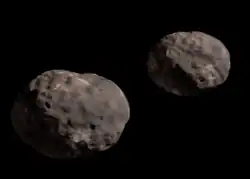 It was estimated[25] that the two components orbit around their center of mass in 4.283±0.004 days at a distance of 680±20 km in a roughly circular orbit.[9] Combining these observations with thermal measurements taken in 2000, the sizes of the components of the system were estimated at 106 km and 98 km, with an equivalent whole-system diameter of 145 km,[9] refined by later measurements from the Keck Observatory to approximately 122 km and 112 km for each partner,[26] and a co-orbital period of 103.5±0.3 hours (4.3125±0.0125 days).[24][18]