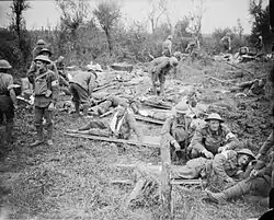 After the fighting died down, Givenchy became a quiet sector, and the 55th Division remained there until the end of August when the Allied counter-offensive began, and the division captured the craters near Givenchy.[32] On 20 September the 1/5th Bn was given responsibility for taking some objectives just north of La Bassée. The battalion attacked with 'B' Company on the right, and 'D' Company with a section of 'C' company on the left, while 'A' Company protected the right flank and the rest of 'C' Company was in reserve. The 'smart little action' was entirely successful, and 'was noteworthy as an example of platoon tactics and the resolute and resourceful leadership of the junior leaders', a number of whom were awarded medals.[33]