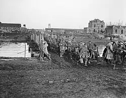 Men of the 55th (West Lancashire) Division cross a pontoon bridge over the Scheldt at Tournai, 9 November 1918.