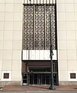 At the time of its completion, 621 17th Street was known as "First National Bank Building", its primary tenant.[4] After First Interstate merged with Wells Fargo in 1996, the building's official name became its address.[4] The 434-foot (132 m) First Interstate Tower North, now known as 633 17th Street, was built adjacent to First Interstate Tower South in 1974.[5] The two buildings together form the First of Denver Plaza.[6] The building with the First of Denver logo can be seen in the opening credits of the television show Dynasty.