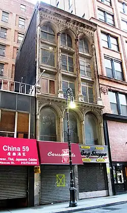 63 Nassau Street is a landmark building located on Nassau Street between Maiden Lane and John Street in the Financial District of Manhattan, New York City. It was built in the Italianate style c.1844, and had its cast-iron facade, attributed to James Bogardus, added in 1857-59, making it one of the first cast-iron buildings in the city. The attribution to Bogardus, a pioneer in the architectural use of cast iron, comes because of medallions of Benjamin Franklin identical to those on four other Bogardus projects, all now demolished. George Washington was also once represented with medallions.[1][2]