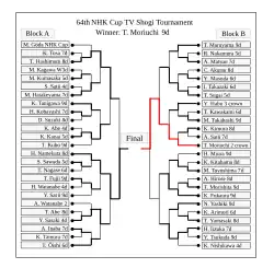 The 64th NHK Cup, or as it is officially known the 64th NHK Cup TV Shogi Tournament (第64回NHK杯テレビ将棋トーナメント, dairokujūyonkai enueichikeihai terebi shōgi tōnamento) was a professional shogi tournament organized by the Japan Shogi Association and sponsored by Japan's public broadcaster NHK. Play began on April 6, 2014, and ended on March 22, 2015. The 50-player single elimination tournament was won by Toshiyuki Moriuchi. All of the tournament games were shown on NHK-E. The host (司会者, shikaisha) during the NHK-E broadcasts was female professional Ichiyo Shimizu.[1]