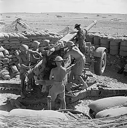 General Erwin Rommel had attacked with his Afrika Korps in Cyrenaica in April 1941, forcing the British Western Desert Force (WDF) back past Tobruk. 51st (London) HAA Rgt had retreated inside the Tobruk perimeter, and had been reinforced by sea by 235 (Kent) HAA Bty with static 3.7-inch guns just before the ring closed round the port on 11 April, beginning the epic 240-day long Siege of Tobruk. The Official History records that the AA artillery was 'incessantly in action against attacks of all kinds, from all heights, but especially by dive-bombers'. The usual targets were the harbour, airfields, base installations, and the AA and field gun positions.[64][65][66][67][68] Early in the siege, RHQ and 152 HAA Bty of 51st HAA Rgt were attacked by Junkers Ju 87 Stukas and suffered serious casualties; the RHQ was evacuated by sea and had to be replaced temporarily by HQ of 13th LAA Rgt. After RHQ of 69th HAA Rgt arrived to take over, it was followed by 192 HAA Bty to relieve 152 HAA Bty.[69][62][70]