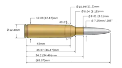 Dimensions were measured from a cartridge loaded by Lapua and from (if two measurements) a case that had been shot with a modified Arisaka. Because the caliber is a wildcat, those can vary greatly. The rim diameter of the 6.5×55mm is 0.480" (12.20 mm).[2]