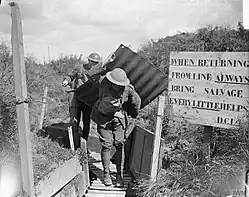 Two men of the 9th (Service) Battalion, Royal Sussex Regiment, bringing in a piece of elephant back iron as salvage, near Lens, 3 September 1918.