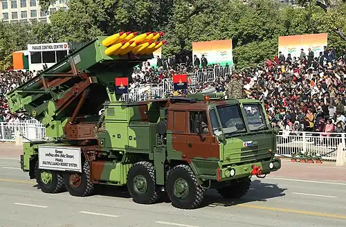 Akash surface-to-air missile system on display at the Republic Day Parade 2025. - Pinaka: A multi-barrel rocket launcher system used for high-volume fire over a large area.