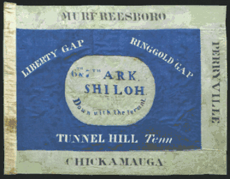 This is a 2nd pattern Hardee battle flag, originally of the 7th Arkansas, but modified for the combined 6th & 7th Arkansas; 30" x 37 1/4"; captured at Jonesboro, Georgia, on 1 September 1864 by Private Henry B. Mattingly, 10th Kentucky Infantry; War Department capture no. 531. This flag bears the embroidered battle honor "SHILOH" in the center of the elliptical disc, over embroidered "Down with the Tyrant", and with "7TH ARK." above it in paint, with "6TH &" added in front of it, both in black. Similarly, three battle honors, "PERRYVILLE." "MURFREESBORO." and "CHICKAMAUGA" painted in black on the white border. Also painted in white on blue field, "LIBERTY GAP", "RINGGOLD GAP", and "TUNNEL HILL, Tenn." This is the flag that the combined 6th and 7th Arkansas carried from their consolidation in November, 1862 until its loss in September 1864. This flag was captured, along with the regiment, when Govan's Arkansas Brigade was overrun and captured by a Federal charge on their position at Jonesboro, Georgia, on September 1, 1864. Private Henry B. Mattingly of Co. B, 10th Kentucky Infantry (U.S.) won the Medal of Honor for the capture of this flag. This flag is in the collection of the Old State House Museum in Little Rock, Arkansas. Dimensions: 28.5" x 37.5"; blue wool bunting, white cotton, silk embroidery, with blue, black, and white painted letters.[28]