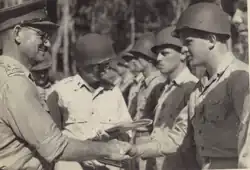 Brigadier Leonard Goss awards US Staff Sergeant Harry Stickel an Air Medal on Stirling Island, 2 March 1944.